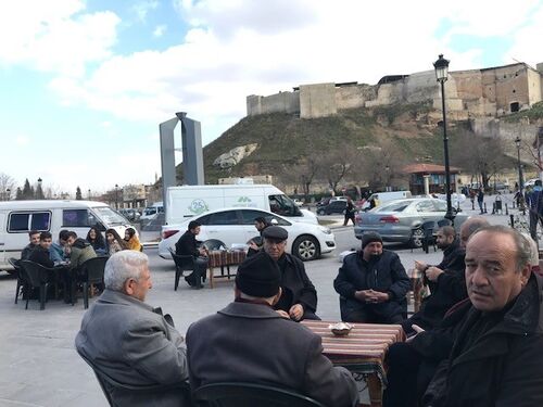 中東の旅から 古城をのぞむ通りのカフェ。週日昼間からゆったりと紅茶を飲んでお喋りをする人々がいる。通りかかると一杯飲んでいけと椅子を勧められ、腰を下ろした。誘った青年は英語もまったく話さず、ニコニコしているだけ。お代を払おうとすると「とんで…