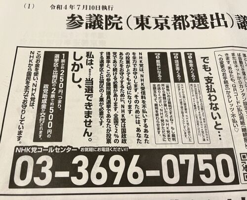 N党の選挙戦術について大きな疑問があった。 まず、参議院選挙公報のN党候補の文面。 N党候補者の選挙公報より 《私は、おそらく当選できません。しかし、1票が約250円。つまり、選挙区と比例区の2票で約500円の政党助成金が交付されます。》 これはいったい…