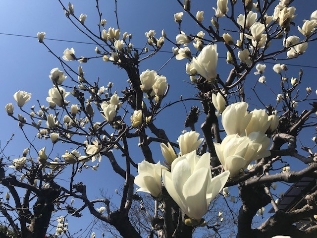 ここ数日で近所のモクレンのつぼみが開きはじめた。青空をバックにした白い花がさわやかだ。