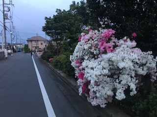 夕暮れ時。いつの間にか満開になっていたサツキの前を通る。
