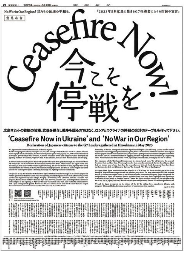 5月半ば、東京新聞にウクライナでの停戦を呼びかける意見広告が出た。戦争そのものに反対し、平和こそ大事だと考える人々が名前を連ねた。善意の広告資金もカンパした。だがなぜか引っかかるのは、この広告の趣旨がロシアの言う代理戦争論に拠っている点である。